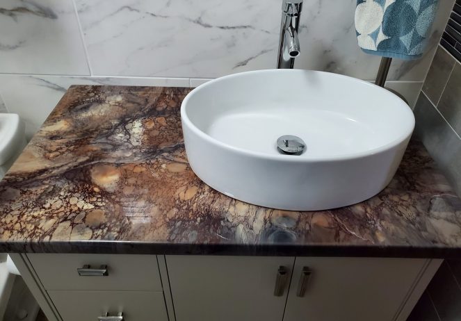Epoxy is the only solid surface that is renewable. All natural and man made products pick up micro abrasions over the years which causes the surface to loose its brand new luster. All of these can be “fixed”. However to repair these abrasions on granite or marble it would cost almost as much as replacing the countertop with new stone. Epoxy is the only product that can be “renewed” with minimum effort and cost.